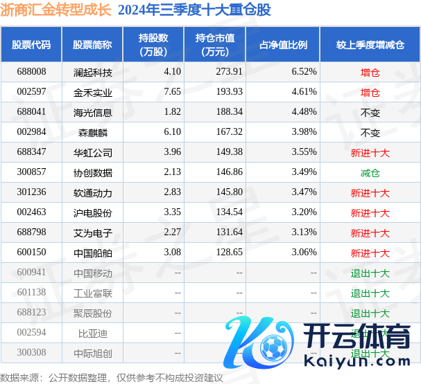 浙商汇金转型成长为混杂型-活泼基金,凭据最新一期基金季报瓦解,该基金金钱竖立:股票占净值比69.0%,无债券类金钱,现款占净值比20.24%。基金十大重仓股如下: