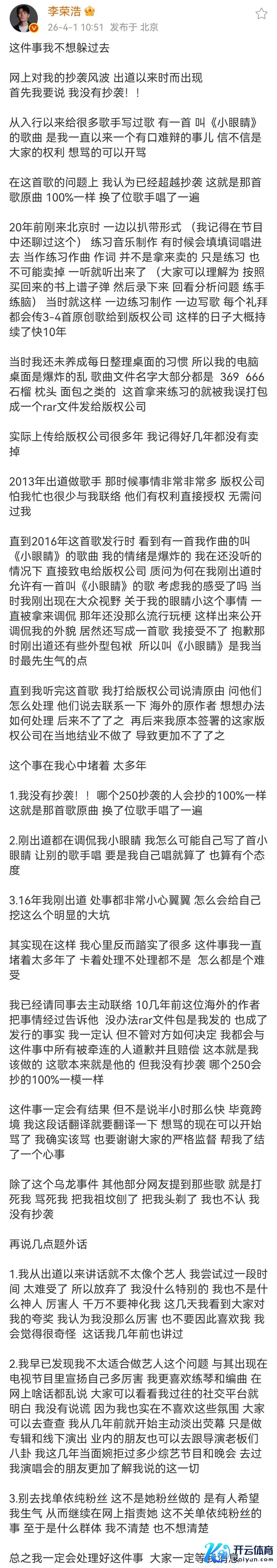 4月1日,李荣浩通过支吾平台发布长文修起“抄袭”一事。李荣浩示意,《小眼睛》的发布是一场“乌龙”,“哪个250抄袭的东说念主会抄的100%同样,这等于那首歌原曲,换了位歌手唱了一遍”。