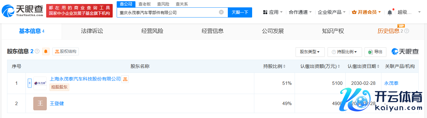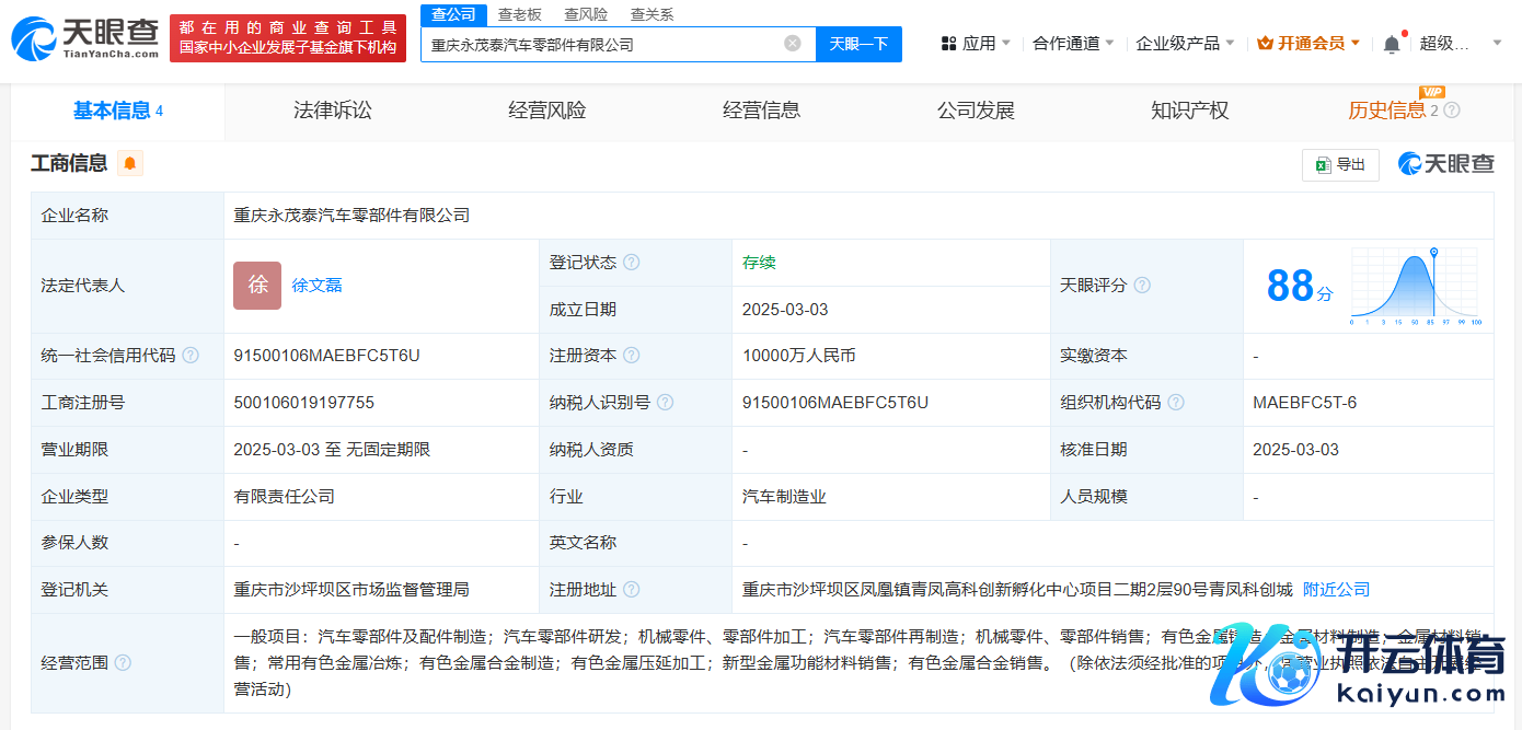 天眼查App泄漏,近日,重庆永茂泰汽车零部件有限公司建树,法定代表东说念主为徐文磊万博manbext体育官网娱乐网,注册本钱1亿东说念主民币,谋划鸿沟包括汽车零部件及配件制造、汽车零部件研发、常用有色金属冶真金不怕火、有色金属合金制造等。鼓吹信息泄漏,该公司由永茂泰(605208)和王登健共同握股。